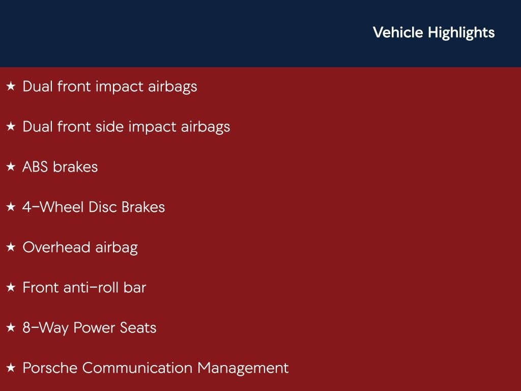 Black S AWD 7-Speed Porsche Doppelkupplung (PDK) 3.0L V6 Sunroof / Moonroof, Back Up Camera, Bluetooth®, 10 Speakers, 4-Wheel Disc Brakes, 8-Way Power Seats, ABS brakes, AM/FM radio: SiriusXM, Automatic temperature control, Axle Ratio: 4.13, Brake assist, Dual front impact airbags, Dual front side impact airbags, Electronic Stability Control, Exterior Parking Camera Rear, Four wheel independent suspension, Front & Rear Heated Seats, Front anti-roll bar, Front dual zone A/C, Front fog lights, Front Seat Ventilation, Fully automatic headlights, Heated door mirrors, Low tire pressure warning, Memory Package, Memory seat, Navigation System, Occupant sensing airbag, Overhead airbag, Panoramic Roof System, Passenger door bin, Porsche Communication Management, Power door mirrors, Power Liftgate, Power passenger seat, Rain sensing wipers, Rear air conditioning, Rear anti-roll bar, Rear side impact airbag, Rear window defroster, Rear window wiper, Remote keyless entry, Security system, Speed control, Speed-sensing steering, Steering wheel mounted audio controls, Telescoping steering wheel, Tilt steering wheel, Traction control, Variably intermittent wipers, Wheels: 19 Macan Design.